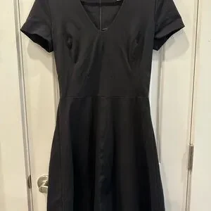This chic black mini dress from Banana Republic features a flattering V-neckline and a classic A-line silhouette, perfect for work or a night out. The short sleeves and sleek design make it a versatile addition to any wardrobe, offering a sophisticated look with a modern edge.