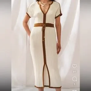 Sancia Celoni Dress is figure flattering in a white knit that skims the frame and contrasting, rich brown trim that accentuates the waist and gives definition. Adjustable drawstring waist. Crew neck with v-neck split opening and button front. Ribbed viscose/cotton knit blend. Size S, but in my opinion this style runs small and in most cases works better for a Size XS. NWT. Posse. St. Agni. SIR. The Fifth. DISSH.