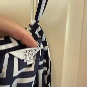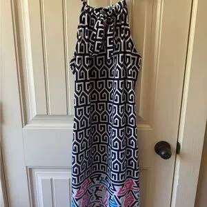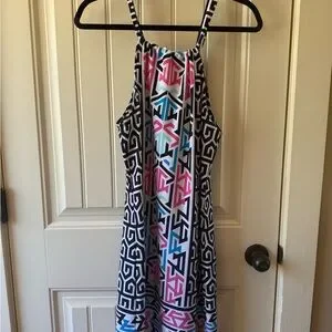 Stylish dress featuring a bold geometric pattern. Colors include black, pink, and blue. Perfect for a chic look. Ties in the back at neck Great for summer. EUC. Worn once. From a pet friendly home. Check out my other listings for bundle savings.