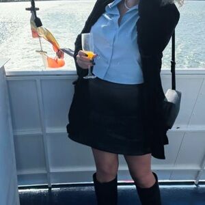 This elegant black faux leather skirt is perfect for any occasion. Its sleek design adds a touch of sophistication to your wardrobe.