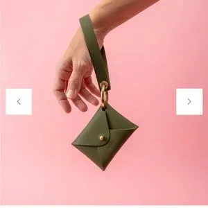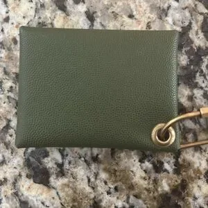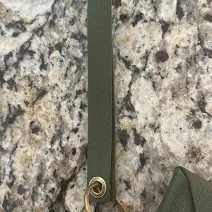Stylish and compact olive green leather wristlet wallet. Perfect for keeping essentials close at hand. Features a sleek design with a secure closure. Excellent used condition.