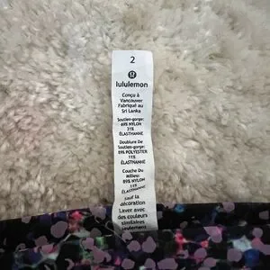 Hard to find Lululemon Seawheeze reflective energy bra in size 2. Vibrant sports bra with a floral pattern. Features a mix of colors on a black base. Perfect for active wear. Padding included! Thanks for looking!