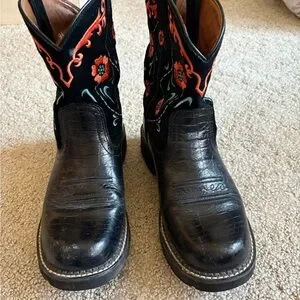 Stylish black leather cowboy boots with vibrant red and green embroidery. Perfect for adding a bold touch to any outfit.