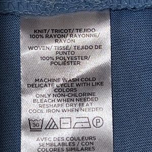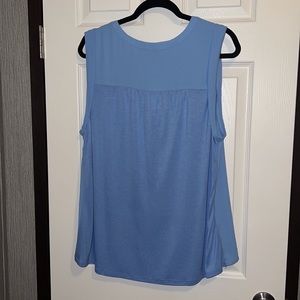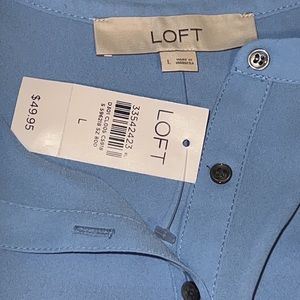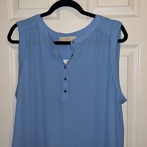 LOFT Henley Mixed Media Shell, Size Large. Color is Glossy Blue. Fluidly woven at front and softly knit at back, this Henley shell is a forever cool yet polished staple with textural appeal. Tab collar, front Henley pocket, sleeveless, soft knit, hits at hip, Measurements laying flat are 23” from armpit to armpit 26” long. Machine Washable. Knit: 100% Rayon, Woven: 100% Polyester. Excellent Condition. New With Tags. Reasonable offers accepted.