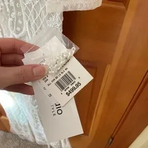 This stunning white lace wedding dress features intricate detailing, perfect for any special occasion. Its elegant design offers a timeless look. NWT NOT SOLD IN STORE ANYMORE