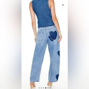 Stylish blue jeans featuring a unique heart pattern. Perfect for adding a playful touch to your wardrobe. So cute! Dets in pics