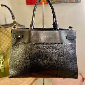 This bag has numerous interior pockets for organization and metal feet to preserve the leather bottom. Includes a leather strap and dust bag for storage.