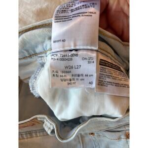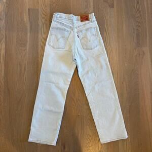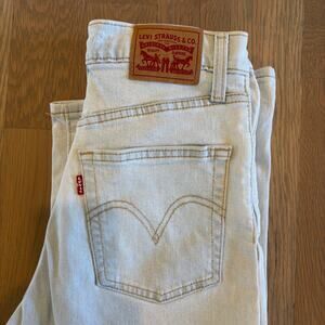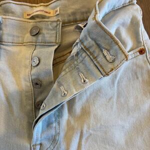 Levi's Ribcage straight cropped ankle length button fly jeans. High waisted and straight leg. Color is faded light blue. Distressed hole over left knee. Excellent condition, no stains. Smoke-free home. Size 26.