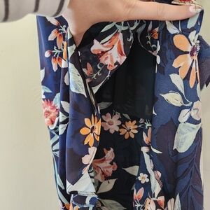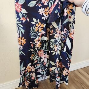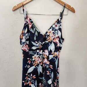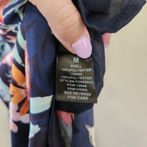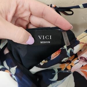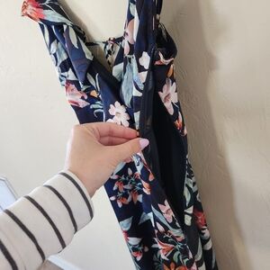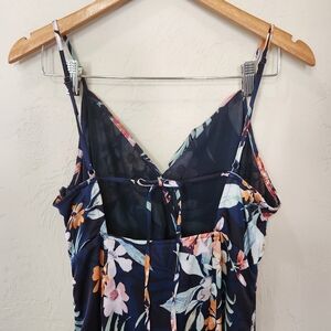 Vici, floral print (I believe this is a retired print - harder to find), satin fabric, v neck with hook closure, hidden zipper with hook closure, tie in back, cascading ruffle detail, adjustable shoulder straps, lined, in excellent condition.