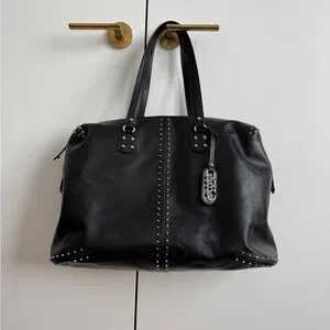 Elevate your style with this chic black leather tote bag. Featuring studded details, it's perfect for any occasion. Carry your essentials in style. Great condition.