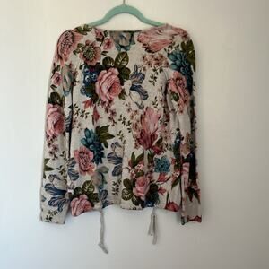 Gorgeous floral with embroidered embellishment Anthropologie Angel of the North sweater. Cashmere blend. Functional drawstring at the waist allows the fit to be adjusted. Excellent condition--minimal piling and no moth holes.