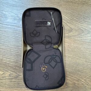 One Della Q Maker’s Canvas Mini Zip Square - Olive, comes with three stitch markers and a darning needle