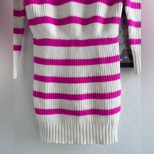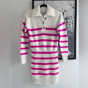 Chic knit dress with bold pink stripes. Features a stylish collar and button details.