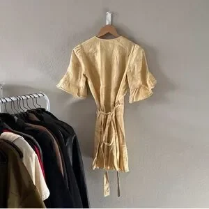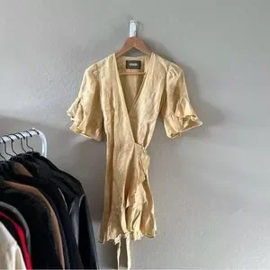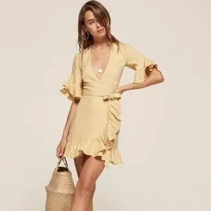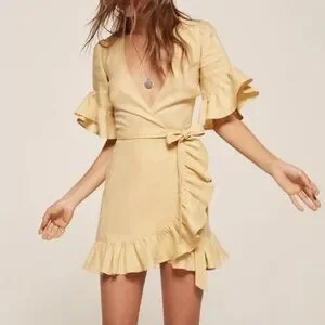 Reformation “Kelsey” linen dress in yellow. Short ruffle sleeves. V-neck. Wrap style. Ruffle hem. Worn gently only a few times. Excellent condition. Size small. From a smoke-free home.