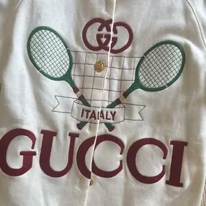 Stylish Gucci cardigan with tennis design. Features green and red accents.