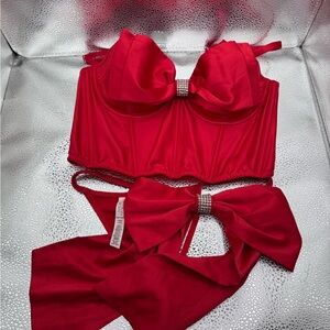 Stylish red bikini set with large bow accents. Perfect for a bold beach look.