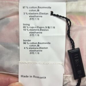 US size 6. Made in Romania. 97% cotton. 3% Elastane. Lining 85% Cupro 15% Elastane. Border 96% cotton 4% Elastane. Beautiful lightweight dress.