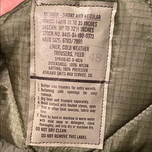Medium size cold weather trousers liner in olive green. Made from nylon with polyester batting.