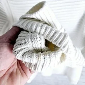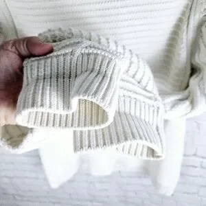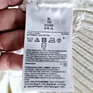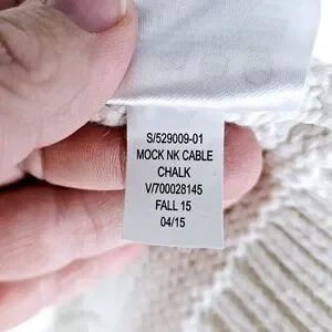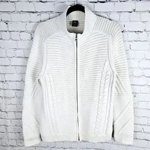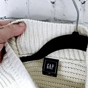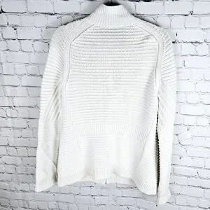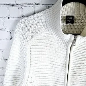 GAP | mock neck cable fisherman chunky knit full zip sweater. There is some discolouration at the cuffs and interior collar (see photos for details) which may come out with treating and wash. Otherwise good pre-owned condition. Pit-to-pit measurement is approximately 21", length 29".