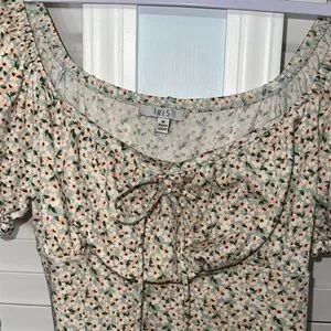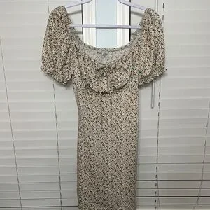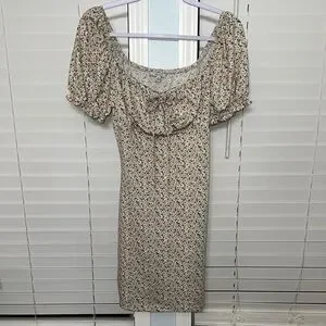 Chic floral dress with puff sleeves, perfect for any occasion. Features a beautiful cream base with delicate floral patterns.