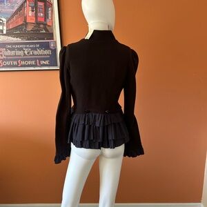 Singular and beyond stylish women’s fitted feminine military black sweater jacket by FREE PEOPLE. Black sweater base with blue black contrasting ruffled edges. Circular front button enclosure, festive pink and black patterned lining. Size 6, measures about 16” pit to pit and 23” long with sleeves around 26”. 97% cotton and 3% spandex, lined in 65% cotton and 35% polyester. Ruffle trim 100% polyester. Darling piece suitable for many occasion! New with tags!