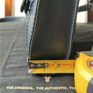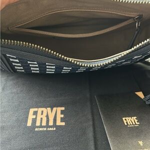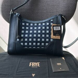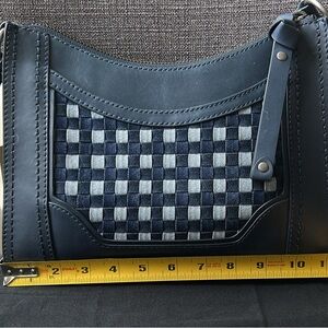 Rare Frye navy leather shoulder bag with gingham look recycled denim on front and back. Outside back pocket and inside zip pocket. Adjustable shoulder strap. See pictures for dimensions. NWT. Original price $198. From smoke free, pet free home.