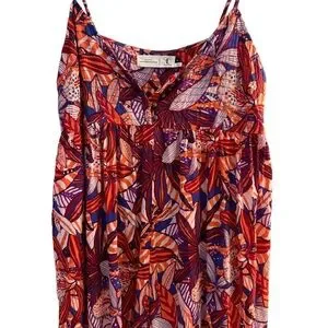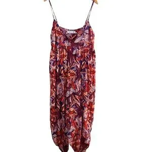 This carefree jumpsuit has 5 button front, adjustable straps and v neckline. Colorful abstract floral design.