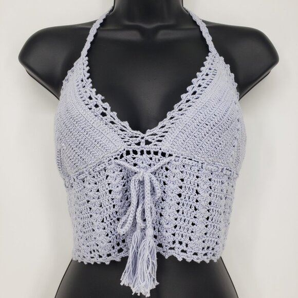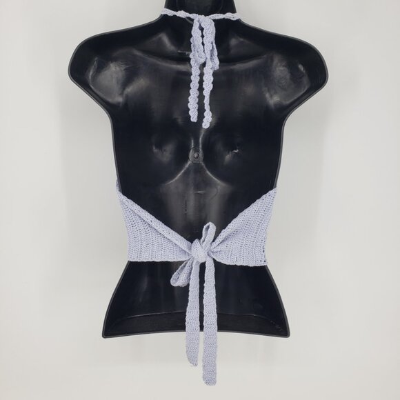 3/$25 Kendall & Kylie Crochet Knit Cropped Halter Top L Boho Backless Ties Blue