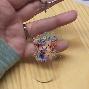 Clear keychain featuring a colorful cow with floral accents. Perfect for adding charm to your keys.