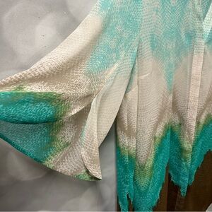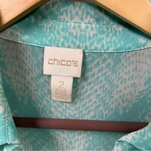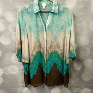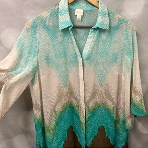 Chico’s button down blouse in size 2 or large in blue, green and brown ombre-like pattern. Semi-sheer and could be worn as a beach covering, pool side, vacation blouse open with a tank or even a belted dress