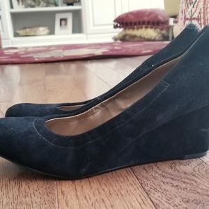 Really great pair of wedges in black suede by Vionic. Beautiful for any occasion to which you need heels. Well made and only worn once! No longer needed.