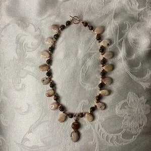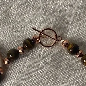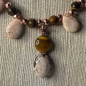 A one of a kind handmade piece featuring tear drop pink turquoise, round tigers eye, copper colored crystals. Measures about 20” long and has a copper toggle clasp.