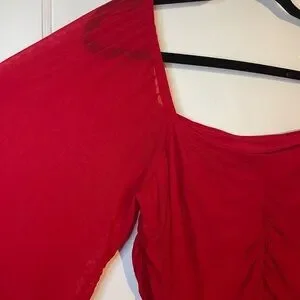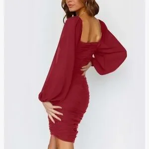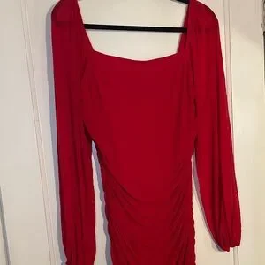 Turn heads with this stunning red dress featuring elegant balloon sleeves. Tailored fit but super flattering ruched material. Perfect for any occasion, this dress combines style and comfort effortlessly. Worn once! Size chart on last picture for reference