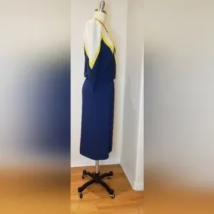 Elegant navy sweater and skirt set with striking yellow accents. Perfect for any occasion. It's long sleeves with shoulder pads add an elegant and professional look along with the skirt. The sweater has a deep v-neck with lining.