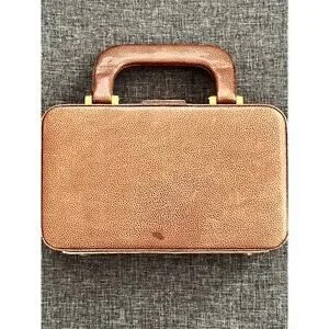 The image shows a Giorgio Beverly Hills pebbled leather clutch. It is a structured, rectangular bag with a top handle and a gold-tone clasp closure. The bag is made of brown pebbled leather and has a brown leather handle. The clasp is gold-toned and has the Giorgio Beverly Hills logo engraved on it. The bag appears to be vintage, possibly from the 1980s or 1990s. The search results confirm that this is a vintage Giorgio Beverly Hills leather bag.