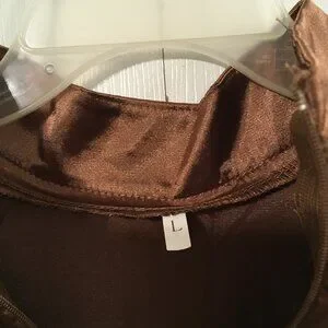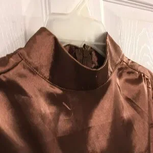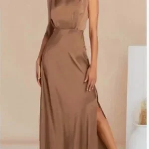 Brown mock neck, long maxi dress with a satin appearance.