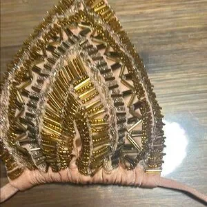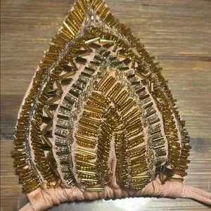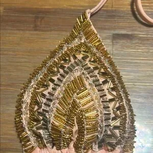 This stunning swim bra features intricate beadwork in pink and gold, creating a luxurious and eye-catching design. The triangle-shaped cups offer a flattering fit, while the soft, ribbon-like straps ensure comfort. Perfect for making a stylish statement at the beach or poolside.