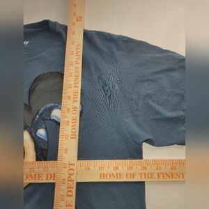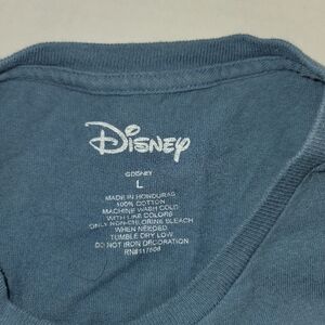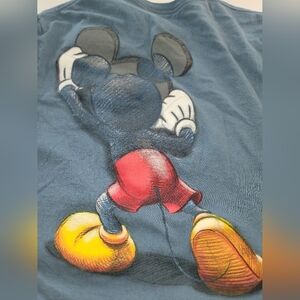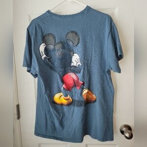 These shirts are pre loved and may have been washed, so fit might be a little different from the manufacturer label. This Disney Mickey Mouse T-Shirt is a men's size large with a solid blue color and a graphic print featuring Mickey Mouse on the front and back. The shirt has short sleeves, a crew neck, and is made of cotton knit fabric for a comfortable fit. It is machine washable and showcases the iconic Disney character in a fun and playful design, perfect for fans of Mickey Mouse and Disney in general.