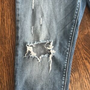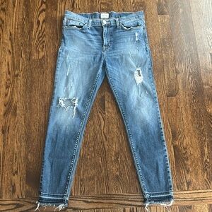 Distressed high rise skinny ankle jeans by Hudson.