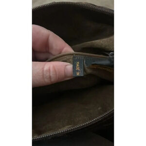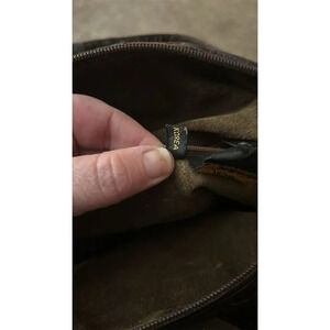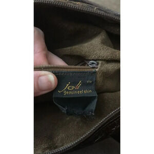 This women's shoulder bag by Joli is made from genuine eel skin leather in a dark brown hue. Perfect for casual occasions, it boasts a spacious interior and a comfortable shoulder strap. Crafted in Korea, this vintage handbag is pre-owned. Keywords: eel skin leather, dark brown bag, women's shoulder bag, vintage handbag, Korean made, casual bag, spacious interior, unique texture, comfortable strap, pre-owned bag.