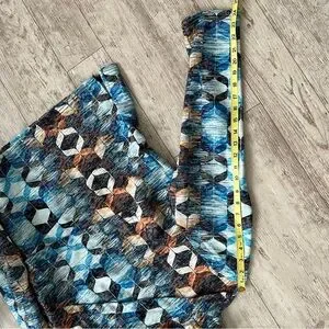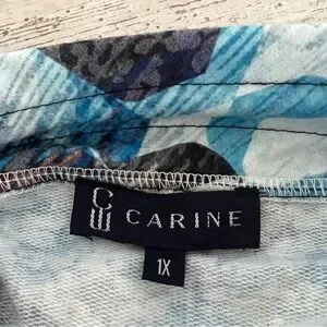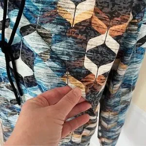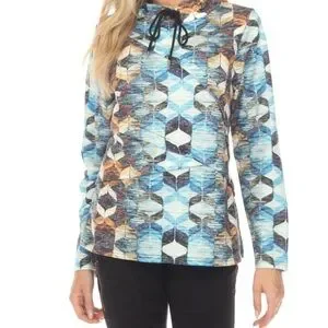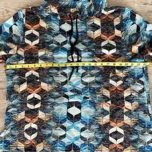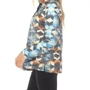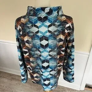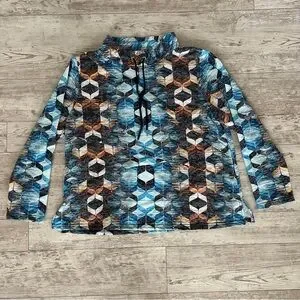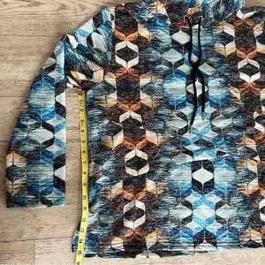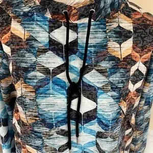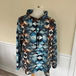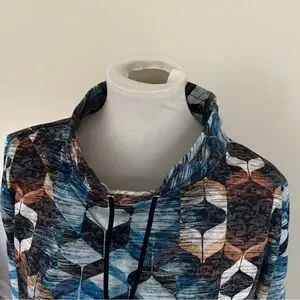 This top features a striking graphic design in cool blue and earthy brown tones, perfect for a modern look. The long sleeves and boxy fit offer comfort and style, while the mandarin collar adds a unique touch. Ideal for casual outings, this sweatshirt is a versatile addition to any wardrobe. 1X = size 18. Perfect with jeans or dress up at work.