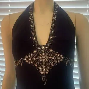 Dusk by Sheila Yen Gorgeous Elegant Dark Navy Blue Formal Prom Halter Gown Maxi Dress women's or misses size 4. Perfect for any formal occasion, Prom, Wedding, Quinceañera, etc