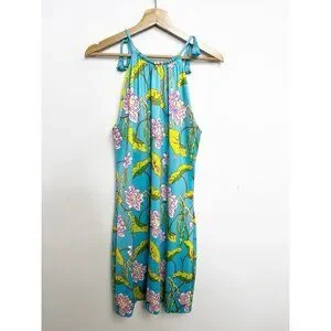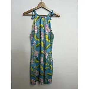 The product is a women's dress made by Gretchen Scott. It is a halter-style dress with a tasseled tie and a sleeveless design. The dress features a knee-length cut and a polyester blend material. It is designed with a floral pattern in multiple colors, including turquoise. The dress is suitable for travel and casual occasions, and it is part of the Tassel Tie Dress product line. The model name is Mystic Garden. The dress has a shift style and accents such as tasseled. It is perfect for the summer and spring seasons, and it is inspired by themes such as nature, flower, resort, American, nautical, colorful, tropical, preppy, designer, beach, love, Hawaiian, and coastal.