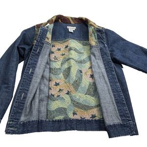 Coldwater Creek Women's Small Cotton Denim Jacket Colorful Flag Tapestry Overlay