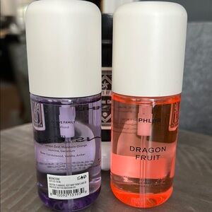 Phlur fragrance mists in Moonstone and Dragon Fruit. Vibrant purple and orange bottles. New. Opened only to smell.