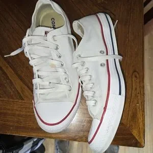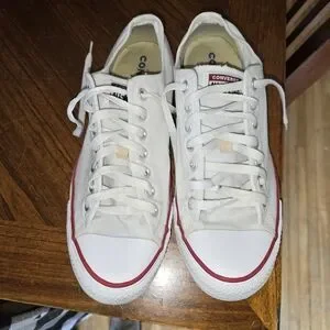These Converse sneakers feature a classic low-top design in a crisp white canvas, complemented by a durable rubber toe cap. The shoes are equipped with white laces threaded through metal eyelets, ensuring a secure fit. A subtle red stripe along the sole adds a touch of style to these versatile sneakers.