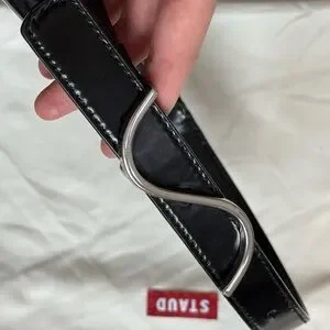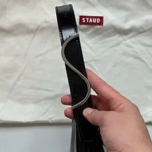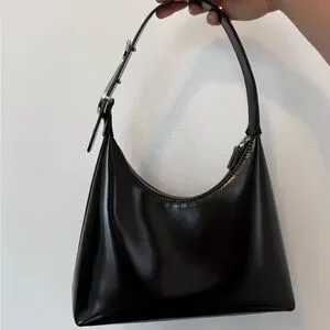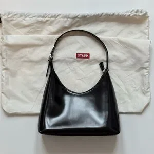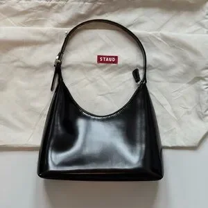 Accentuate your style with the Staud Black Leather Women's Bag. This elegant bag with a glossy finish is a must-have accessory and is perfect for any occasion. inside there is one large compartment and a small zipped pocket on the side, the lining is made of black suede, the bag is lightweight, not large, but roomy enough, the bag is in excellent condition, the original dust bag is included.