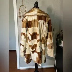 Elevate your wardrobe with this chic faux fur coat, featuring a luxurious brown and cream pattern. Perfect for adding a touch of elegance to any outfit.
