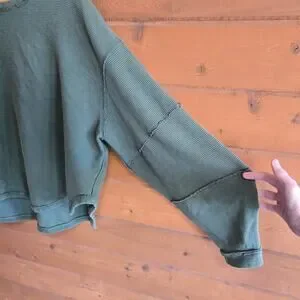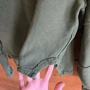 Color is beautiful deep dark green tone, factory seam distressing details and a all over ribbed texture. Loose FP oversized fit in my opinion. Great condition has been hand washed and line dried.