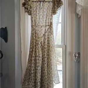 Stunning silk dress in GUC condition. The bottom was taken up 3 inches professionally and ties were added with the bottom material. Since it is a delicate silk dress there is some seam stress and Discoloration that cannot be seen when worn. Carefully review all the pictures for condition. Listed at a much lower price due to the flaws.